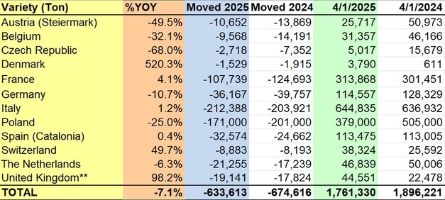 A 1 de abril de 2025, las existencias de manzanas en Europa ascendían a 1.761.330 toneladas, lo que supone un descenso interanual del 7,1% respecto a las 1.896.221 toneladas registradas a 1 de abril de 2024. Este descenso de 134.891 toneladas es evidente en la mayoría de los principales países productores, con notables reducciones en Polonia (-126.000 toneladas), Alemania (-13.772 toneladas) y Bélgica (-14.809 toneladas). La mayor caída en volumen absoluto se produjo en Polonia, donde las existencias pasaron de 505.005 toneladas en 2024 a 379.000 toneladas en 2025. Francia, pese a una menor variación interanual del 4,1%, siguió siendo uno de los mayores tenedores, con 313.868 toneladas.