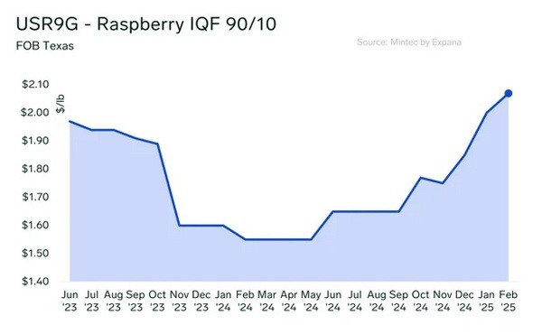 Los resultados económicos de la cosecha estadounidense de frambuesas mejoraron, con un valor total estimado en 475 millones de dólares, un 26% más que la temporada anterior. Al mismo tiempo, surgieron problemas de abastecimiento internacional, que afectaron especialmente al mercado de la frambuesa congelada. Los operadores del mercado de Expana informan de una escasez de frambuesas 90/10 IQF de la cosecha de Serbia de 2024, que había disminuido un 30%-40%. En consecuencia, los precios de las frambuesas IQF serbias aumentaron, oscilando entre 5,50 y 6,60 dólares por kilo para la cosecha de 2024. Este año, los operadores del mercado mexicano están notando que la oferta de frambuesas 90/10 es más escasa, y los precios se mantienen en niveles elevados en comparación con el año pasado.