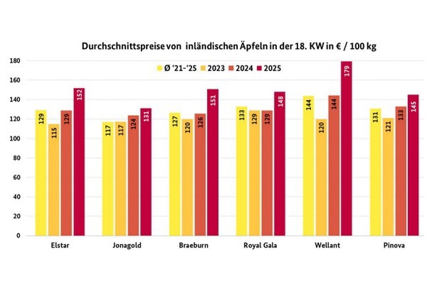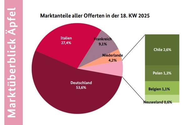 Las manzanas nacionales siguieron dominando el mercado, aunque su disponibilidad se redujo algo en general. Wellant, Boskoop, Braeburn y Pinova perdieron importancia, y Pink Lady y Granny Smith fueron las principales variedades procedentes de Italia, mientras que de Francia había Pink Lady y Jazz. La fruta holandesa también estaba disponible en las tiendas. Los productos belgas solo se comercializaron en cantidades limitadas y, según la BLE, las frutas polacas no tuvieron más allá de un carácter complementario.