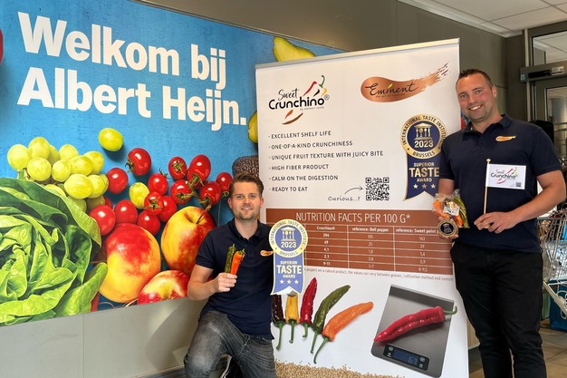 Desde mediados de abril hay un nuevo tipo de pimiento disponible en 800 tiendas de Albert Heijn en los Países Bajos. Se trata de Sweet Crunchino®, una nueva variedad desarrollada por Eminent Seeds. En el envase, en el que pone "Sabor extra dulce", también figura el nombre de la marca. Esto último es muy especial para un mercado en el que no abundan las marcas.