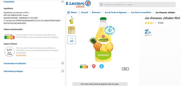 La etiqueta Carbon Impact en la página web de Leclerc Drive para el zumo de piña Jafaden.