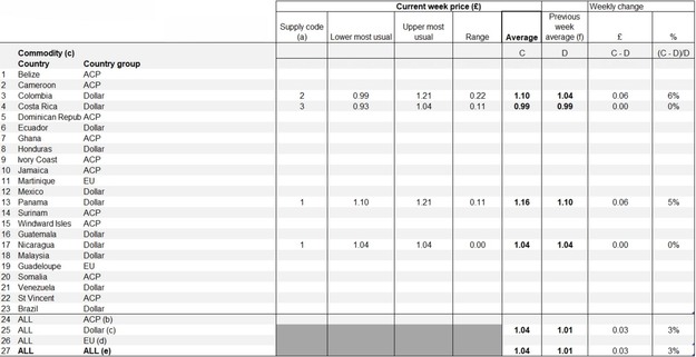 Los últimos datos sobre precios muestran un notable aumento de los precios de la banana de Colombia y Panamá. En Colombia, el precio medio de la banana pasó de 1,04 £ por kilogramo en la semana 18 a 1,10 £ en la 19, lo que refleja un aumento de 0,06 £ , aproximadamente una subida del 6%. Esta tendencia al alza pone de manifiesto un ajuste constante de los precios de la banana colombiana en el mercado.