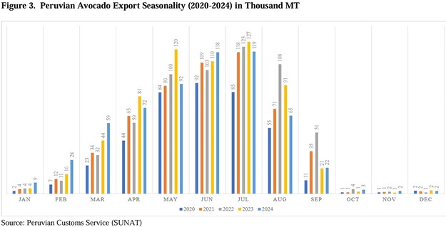 Se espera que la producción peruana de aguacate se recupere en 2025, con unas exportaciones previstas de 630.000 toneladas, un aumento del 2 por ciento en comparación con la temporada 2024, que fue difícil, con una disminución de las exportaciones de un 4 por ciento hasta situarse en 594.000 toneladas a raíz de un frío inusual que redujo la productividad. Sin embargo, persiste la preocupación por el posible impacto de un inminente patrón climático de La Niña a lo largo de la costa peruana, que podría limitar el crecimiento de la producción a pesar de la expansión de las superficies plantadas.