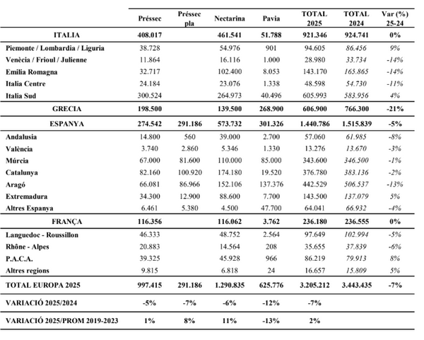 Según los datos presentados en Europêch, Europa quedaría por debajo de su potencial productivo con una previsión de cosecha para 2025 de 3,2 millones de toneladas de melocotones y nectarinas, un 7% inferior a la cosecha de 2024 y un 2% superior a la media de 2019/2023.