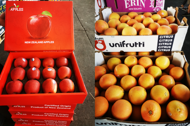 Izquierda: caja de regalo de manzanas importadas. Derecha: pomelos sudafricanos.