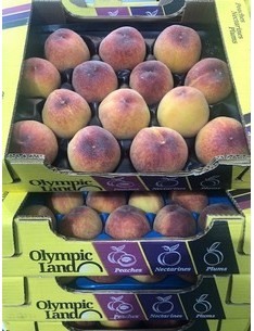 Los albaricoques griegos suelen estar disponibles hasta mediados de agosto, mientras que las nectarinas y los melocotones (foto de la derecha) se comercializan hasta finales de agosto o principios de septiembre.