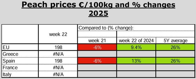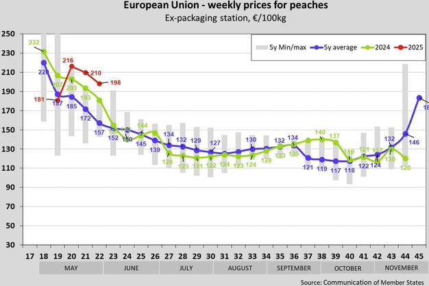 En comparación con la misma semana de 2024, el precio de 198 euros de la semana 22 supone un aumento del 9,4% a escala de la UE. En España, que es el único país con datos disponibles para este periodo, los precios también cayeron un 6% respecto a la semana anterior, pero siguen siendo un 13% superiores a los de la misma semana del año pasado. Esto sitúa los precios actuales del melocotón en la UE y en España aproximadamente un 26% por encima de sus respectivas medias quinquenales.