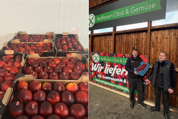 Además de cerezas, desde mediados de mayo también se dispone de albaricoques, nectarinas (foto de la izquierda) y melocotones de origen español seguidos de los paraguayos en la semana 21. Aunque los precios son ligeramente superiores a los del año pasado, la demanda es siempre satisfactoria. Derecha: Empleados de Raiffeisen Obst & Gemüse GmbH muestran las primeras cerezas de Coblenza del año.