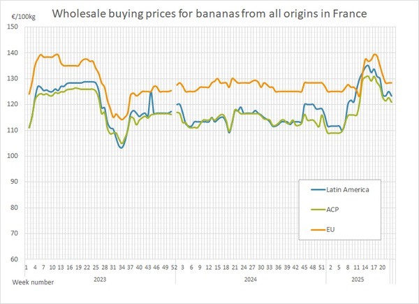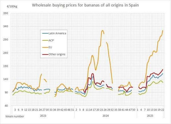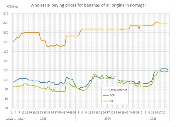 España experimentó un modesto repunte en los precios de la banana durante el mismo periodo. La semana 21 registró una media de 157 euros/100 kg, que subió a 162 euros/100 kg en la semana 22. El aumento de 5 euros sugiere un estrechamiento a corto plazo de la oferta o una demanda elevada en el mercado español.