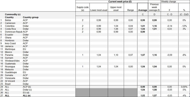Panamá también experimentó un descenso en los precios de la banana, aunque no tan pronunciado como el de Colombia. El promedio de la semana 22 para Panamá fue de 1,16 £ por kg, mientras que en la semana 23 fue de 1,07 £ por kg. Estas cifras subrayan la naturaleza fluctuante de los precios de la banana en estos países, con descensos en Colombia y Panamá, en contraste con el ligero aumento de Costa Rica.