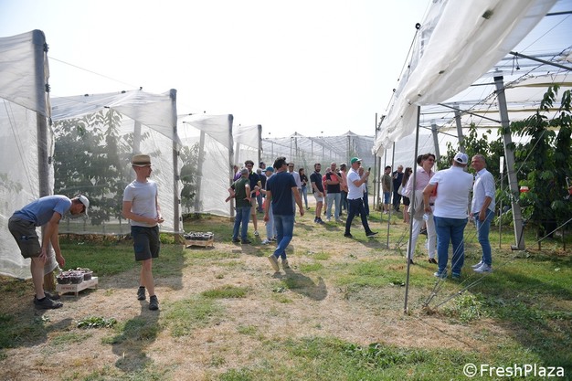 Casi 150 personas, entre técnicos, agricultores y operadores de la cadena de suministro, participaron el 10 de junio en una visita al nuevo campo experimental de cerezos de Salvi Vivai en Portomaggiore (Ferrara). Con la impecable organización que siempre caracteriza los eventos de Salvi, los invitados pudieron comparar diferentes variedades de cerezas, con diferentes portainjertos, bajo dos tipos de cubierta y con distintos marcos de plantación.