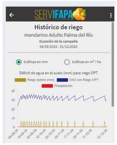 Para ello, Riego Citrus cuenta con un módulo de programación de riego basado en el balance hídrico del suelo y tiene una integración automática con los datos actualizados de la Red de Información Agroclimática de Andalucía (RIA). Además, se puede configurar con notificaciones semanales, descargar tablas y gráficos, así como consultar tanto la programación de riego como los datos de la parcela monitorizada.