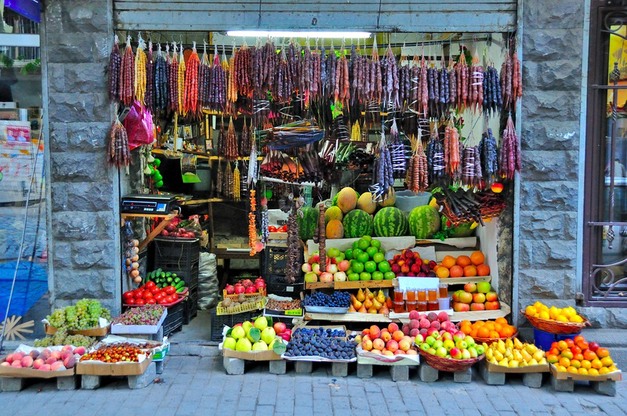 Frutería de Tiflis donde se vende churchkhela, un aperitivo tradicional georgiano parecido a un caramelo que se prepara sumergiendo frutos secos unidos por un hilo en zumo de uva espesado y desecado.