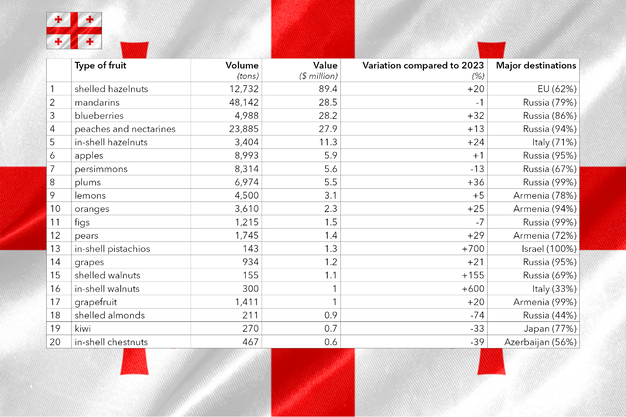 Las exportaciones de frutas ascendieron a 236 millones de dólares en 2024, lo que supone un aumento interanual del 14%. Las importaciones se situaron en 143 millones de dólares, un 40% más. Georgia importó fruta de 60 países, con Ecuador (bananas), Turquía, Estados Unidos, Irán y varios países de la CEI como principales proveedores. Los Países Bajos (principalmente como centro de tránsito) representaron el 5% del suministro exterior de fruta de Georgia, mientras que otros países de la UE aportaron colectivamente una cuota similar.