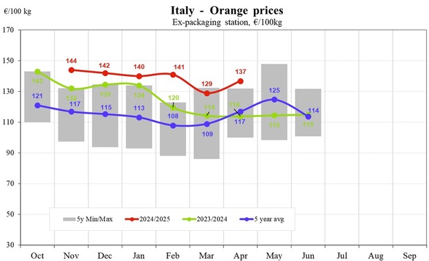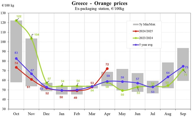 Entre febrero y abril de 2025, los precios de las naranjas variaron significativamente en España, Grecia, Italia y Portugal. En España, los precios aumentaron de forma constante, pasando de 81 euros/100 kg en febrero a 84 euros en marzo y 90 euros en abril. Este aumento gradual refleja la firmeza de la demanda interna y la posible escasez de oferta a medida que avanza la temporada.