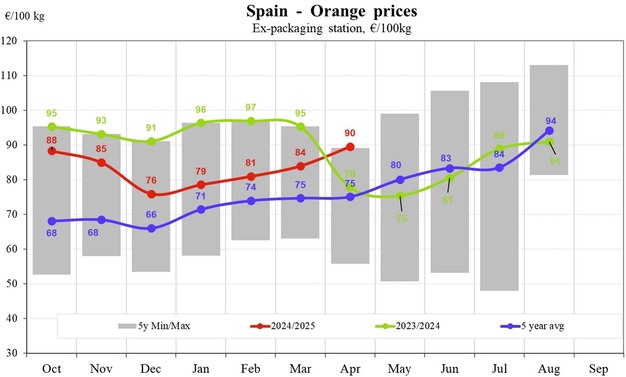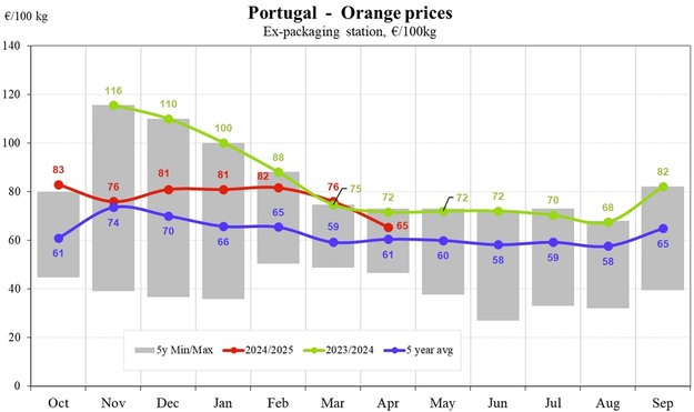 Portugal, por el contrario, mostró una tendencia a la baja. Los precios cayeron de 82 euros en febrero a 76 euros en marzo y bajaron aún más hasta 65 euros en abril. Este descenso puede atribuirse a la mayor presión de la oferta o al debilitamiento de la demanda de exportación, que ha llevado los precios a niveles inferiores a los observados a principios de la temporada.