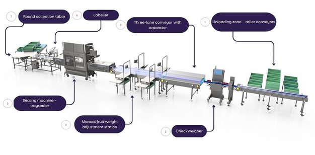 "Su estructura compacta la hace ideal para centros de envasado con espacio limitado. Aunque las máquinas que componen la línea pueden ajustarse a las necesidades del cliente, siempre combina dos elementos: una controladora de peso y una desviadora", afirma Milewski. "Cuando los paquetes de fruta llegan del campo, tras haber sido pesados manualmente, pasan por una báscula de control para determinar su peso exacto. A partir de estos datos, un transportador de 3 carriles con desviador guía cada tarrina por la ruta designada".
