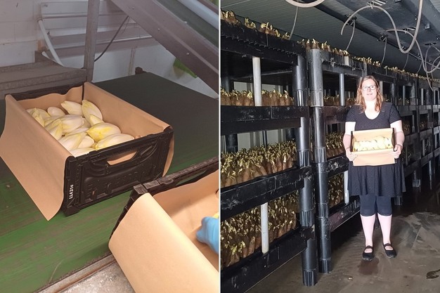 Izquierda: Endivias preenvasadas para el retail alemán. Derecha: Endivias frescas en la cámara de forzado.