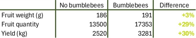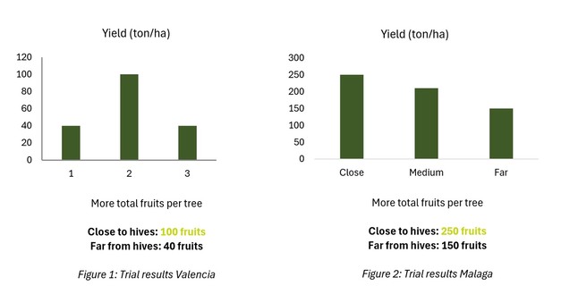 Pruebas de campo realizadas en España y Turquía, en colaboración con instituciones académicas, han demostrado que la instalación de colmenas de abejorros mejora el rendimiento entre un 30 y un 50% sin reducir el tamaño medio de los frutos. En algunos casos, los árboles situados cerca de las colmenas han producido más del doble de fruta que los más alejados. Los resultados sugieren que el aumento de la actividad de los polinizadores en las plantaciones puede mejorar el cuajado de los frutos, debido potencialmente a una mayor competencia entre los polinizadores.