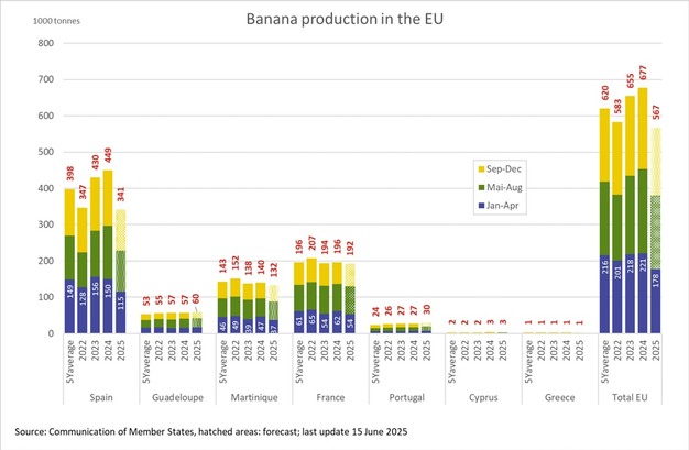 Según las últimas cifras publicadas por la Dirección General de Agricultura y Desarrollo Rural de la Comisión Europea, se prevé que la producción de bananas de la Unión Europea en 2025 alcance las 566.592 toneladas. Esto supone un descenso respecto al total confirmado de 676.603 toneladas en 2024. El descenso de la producción se refleja en varias regiones productoras, como España, Francia, Martinica, Guadalupe, Portugal, Chipre y Grecia.