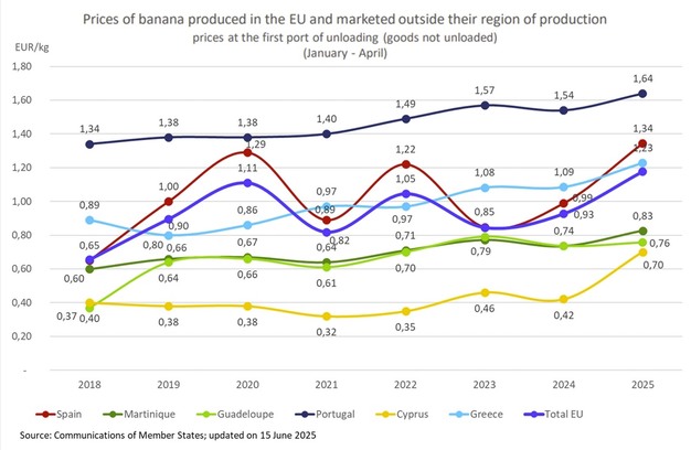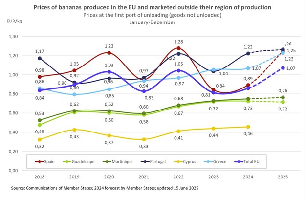 España sigue siendo el principal productor de banana (plátano) de la UE, con un total previsto de 341.490 toneladas para 2025, por debajo de las 449.202 toneladas de 2024. Se prevé que el precio medio en el punto de entrega aumente a 1,25 euros por kg, frente a los 0,89 euros por kg del año anterior. Otras regiones, como Guadalupe y Martinica, también registran menores volúmenes previstos para 2025, aunque los precios en estas zonas siguen siendo comparativamente más bajos, sobre todo en Guadalupe, donde el precio medio en origen es de 0,72 euros por kg.