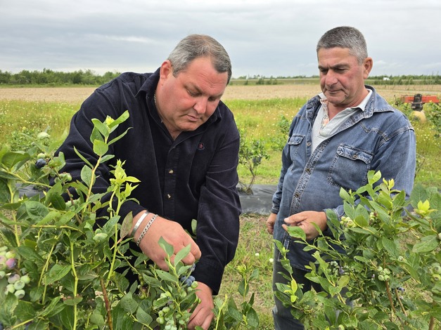 Los responsables de producción de GeoOrganic, Irakli Basheleiahvili y Levan Katsiashvili, prueban la madurez de los arándanos a principios de junio de 2025.