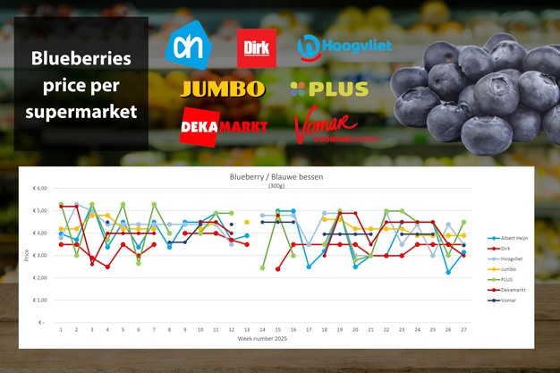 Para los arándanos, las diferencias de precio siguen siendo notables. Hay algunas promociones bastante llamativas. Destaca la de DekaMarkt, con un precio de tan solo 2,99 euros por 300 gramos. En Albert Heijn, los arándanos siguen en promoción, pero el precio es 90 céntimos más alto que en la semana 26 y se sitúa en 3,14 euros. En Plus, los clientes pagan el precio más alto: 4,49 euros.