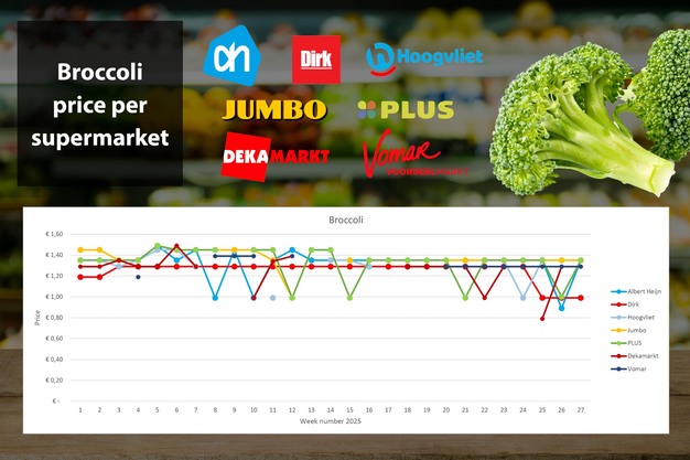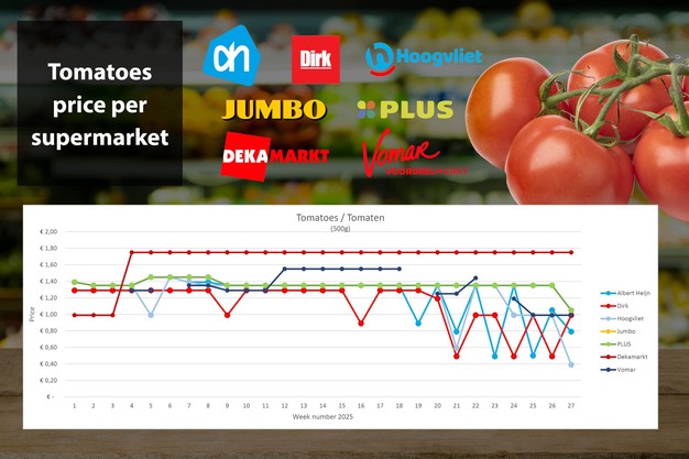 Tanto en Albert Heijn como en Hoogvliet, el precio en la semana 27 se ha situado bastante por debajo de la media de 1 euro por 500 gramos. En Hoogvliet, ha llegado a caer hasta los 60 céntimos. DekaMarkt sigue teniendo un precio relativamente alto, con 1,75 euros por 500 gramos.