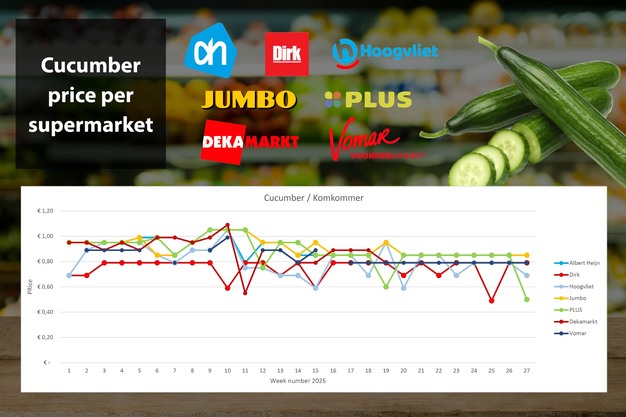 En las últimas semanas no había habido ninguna promoción con los pepinos, pero en la semana 27 han estado de oferta en 3 retailers a la vez. En Albert Heijn y Plus se han estado vendiendo por 50 céntimos. Hoogvliet también ha rebajado su precio, que asciende a 69 céntimos. En Dirk, DekaMarkt y Vomar cuestan 79 céntimos.