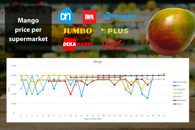 Tanto Albert Heijn como Jumbo han subido el precio del mango 10 céntimos en la semana 27, situándolo por encima de los 2 euros. En Dirk y Hoogvliet, los precios se mantienen en 1,79 euros por unidad, mientras que en DekaMarkt y Vomar se sitúa aún en 1,99 euros.