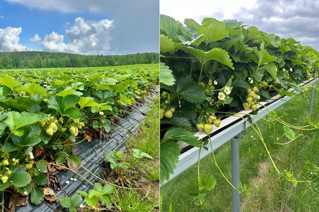 Izquierda: fresas Verdi cultivadas en Suonenjoki, 25 de junio de 2025. Derecha: fresas Falco en canales en Laitikkala, 10 de julio de 2025.