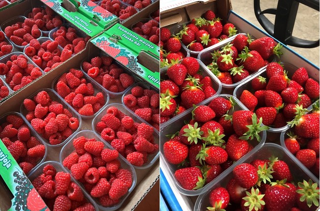 Izquierda: Frambuesas finlandesas en packs de 8x175 gramos - variedad Vajolet. Derecha: Fresas finlandesas Favori de cultivo en túnel en packs de 8x400 gramos.