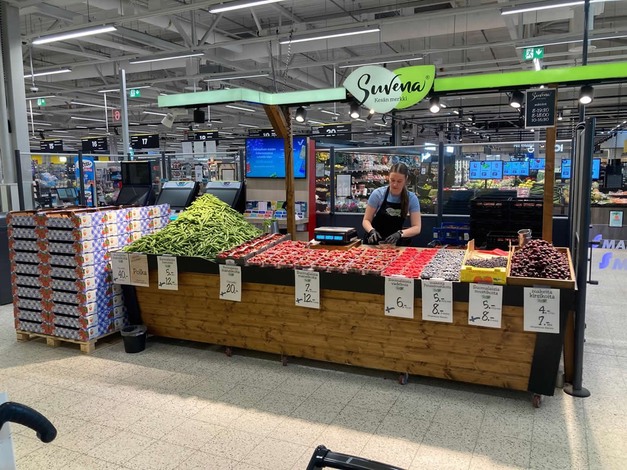 En la actualidad, Suvena dispone de 16 locales en supermercados con sus propios vendedores; por eso, en el punto álgido de la temporada, hay hasta 75 personas en plantilla. "Colaboramos con una cadena y disponemos de puntos de venta en la zona de Tampere, la segunda ciudad más grande de Finlandia. También tenemos varios puestos en centros comerciales y actualmente estamos vendiendo nuestros frutos rojos en la principal estación de tren de Tampere, por la que pasa mucha gente. Seguimos creciendo cada año. Suministramos un poco a mayoristas, pero nos centramos sobre todo en el consumidor. Seleccionamos siempre las fresas más sabrosas y bonitas con el objetivo de que quien las compra quiera volver a por más. Si ayer compraste una fresa deliciosa, lo normal es esperar que esa misma fresa esté ahí al día siguiente".