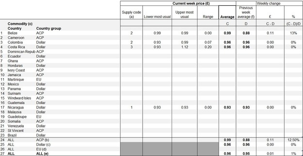 Por el contrario, ni Colombia ni Costa Rica no registraron cambios en los precios de la banana. Para cada país, el precio medio se mantuvo estable en 0,96 libras, igual que la media de la semana anterior. Esto indica estabilidad de precios en esos mercados durante la semana analizada. No se observaron fluctuaciones en el rango de precios para estos países, con Colombia mostrando un rango de precios de 0,07 £ y Costa Rica 0,20 £.