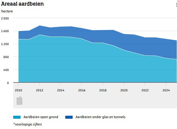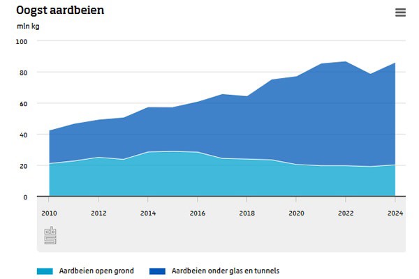 En 2024 se cosecharon en los Países Bajos más de 86 millones de kilos de fresas, el doble que en 2010. Esto se debió sobre todo a que se cultivaron más fresas bajo túneles de cristal y plástico, dado que la superficie total se redujo en más de un 15% durante el mismo periodo, hasta situarse en 1.400 hectáreas. La superficie dedicada a otros frutos pequeños, como las berries, cayó después de alcanzar su punto máximo en 2018, según datos de Statistics Netherlands (CBS).