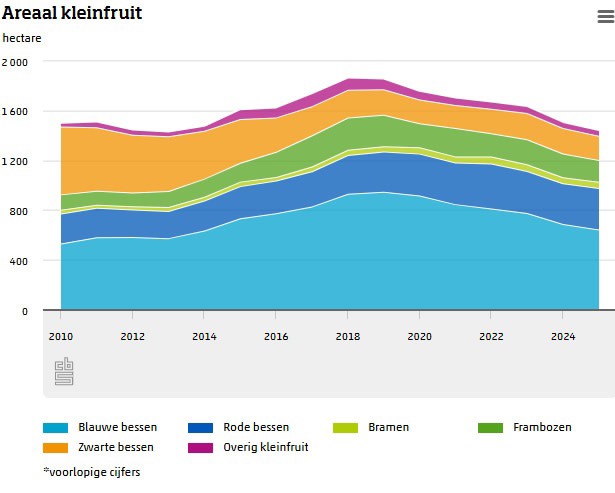 En 2025 se cultivaron 1.400 hectáreas de berries al aire libre. Esto incluye arándanos, grosellas rojas, moras, frambuesas, grosellas negras y otros frutos pequeños. La superficie dedicada al cultivo de berries se ha reducido en casi un 4% desde 2010.