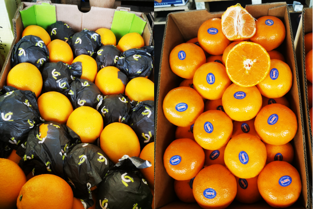 Izquierda: naranjas Witkrans de Sudáfrica. Derecha: mandarinas Honey Murcott de Australia.
