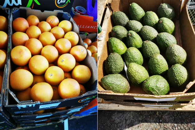 Izquierda: pomelos sudafricanos. Derecha: aguacates peruanos.