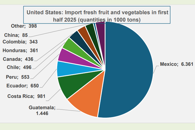 Más de la mitad de todas las frutas y hortalizas frescas importadas en el primer semestre del año han procedido de México. Dado que México suministra una gama comparativamente "cara", la cuota en términos de valor es de casi el 60%. Tomates, pimientos y aguacates son los principales productos que Estados Unidos recibe de México. En el primer semestre del año, el precio medio de las importaciones procedentes de México ha sido hasta un 7% inferior al del primer semestre del año pasado.