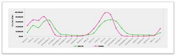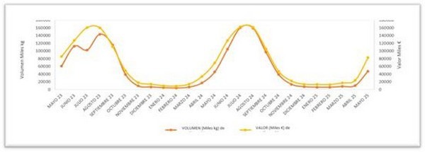 © MAPA Volumen (miles de kg) y valor (miles de €) de melón y sandía. Datos de mayo de 2023 a mayo de 2025.