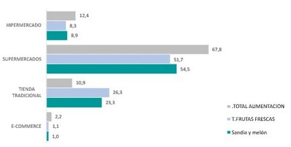 El supermercado es el canal preferido por los españoles para adquirir estas frutas, que concentran el 54,5% de las compras. Entre las frutas frescas adquiridas en este tipo de establecimiento, el melón y la sandía destacan como las más demandadas. Le siguen las tiendas tradicionales con el 23,3% del volumen total y el hipermercado como tercer canal de distribución.