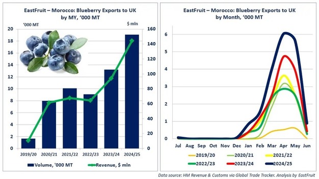 El Reino Unido es ahora uno de los principales destinos de exportación de arándanos marroquíes, después de España y los Países Bajos. La temporada marroquí va de diciembre a junio, con volúmenes máximos en abril. Durante este periodo, España, Países Bajos y Alemania fueron los principales competidores de Marruecos en el mercado británico.