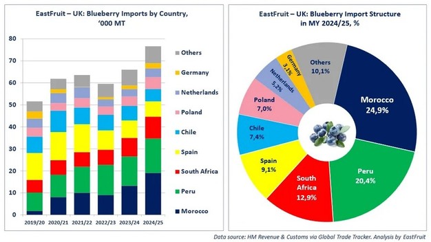 El aumento de la demanda de los consumidores británicos sigue impulsando las importaciones de arándanos. Esta temporada, casi todos los principales proveedores aumentaron sus envíos, excepto España y Chile. Marruecos registró el mayor crecimiento, y los arándanos procedentes de este país representaron casi el 25% del total de las importaciones británicas. El suministro marroquí dominó varios meses, superando el 50% de la cuota de mercado británica en marzo y mayo y alcanzando hasta el 75% en abril.