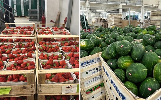 Fruta de verano en el departamento de entrada de mercancías de la empresa: fresas nacionales y sandías griegas.