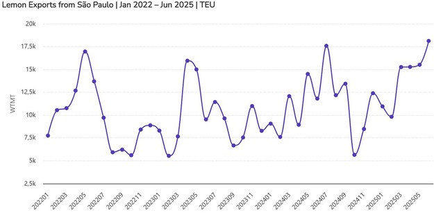 El estado de São Paulo es el mayor productor de limón de Brasil y sigue ampliando sus exportaciones. Según el Instituto de Economía Agrícola (IEA - Apta), dependiente de la Secretaría de Agricultura y Abastecimiento (SAA) de São Paulo, en 2024 se cosecharon más de 1,1 millones de toneladas. En el primer semestre de 2025, las exportaciones alcanzaron 81.000 toneladas por valor de 72 millones de dólares, un 21% más que en el mismo periodo del año anterior.