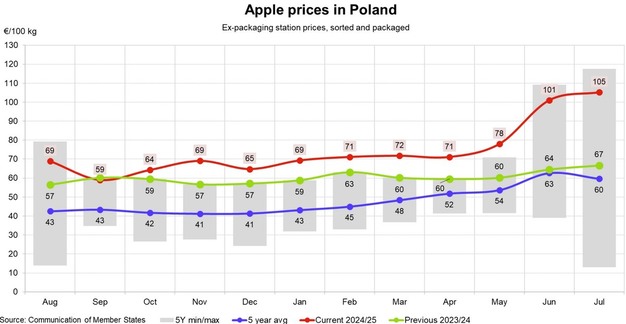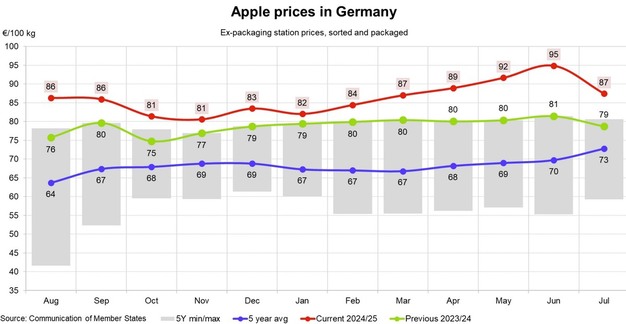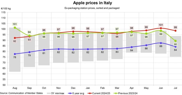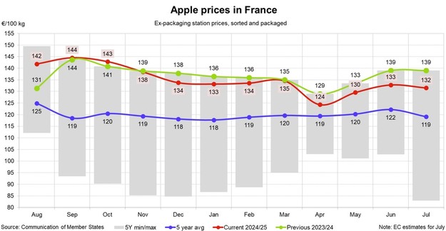 Francia mostró una modesta corrección al alza a principios del verano, pero se estabilizó en julio. Los precios pasaron de 130 euros/100 kg en mayo a 133 euros en junio, antes de bajar ligeramente a 132 euros en julio. A pesar de la caída de mitad de temporada a principios de año, los precios franceses de la manzana se mantienen dentro de la horquilla a largo plazo y cerca de los resultados del año pasado.