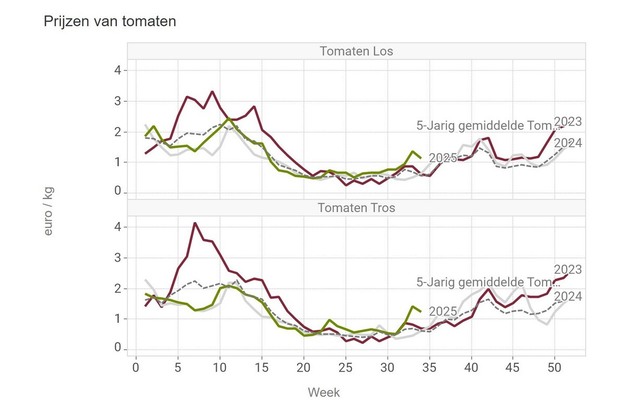 En la semana 34, los precios del tomate en Bélgica no siguieron subiendo, pero sí se mantuvieron en niveles elevados. Así lo refleja el nuevo balance de precios medios de la subasta de la Federación de Cooperativas Hortícolas de Bélgica (VBT). En cambio, en el caso de pepinos y los pimientos, las cotizaciones descendieron.