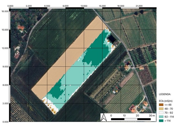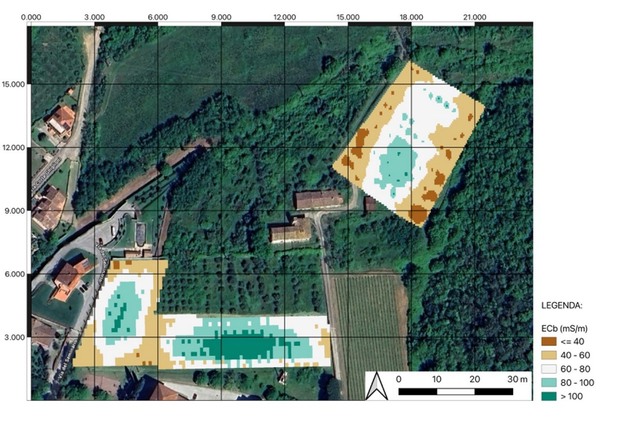 Mapas de conductividad eléctrica aparente de los viñedos de Calafata y Campo al Noce.