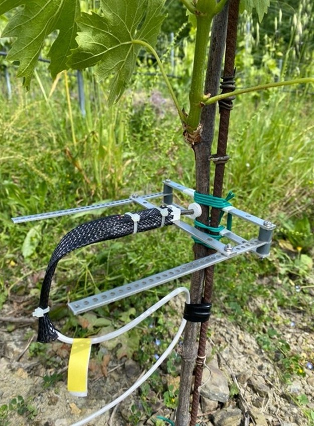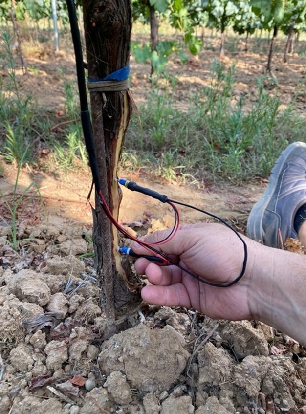 Y no solo eso, gracias a una reciente función de software (detección de estrés), las líneas de intervención de estrés y riego pueden establecerse de forma aún más precisa. Para mejorar aún más la robustez y precisión del modelo de detección de estrés que Sentek ha implementado en el software, se han utilizado sensores de flujo de savia del tipo Granier (Fig. 4), que medían continuamente los flujos de savia, proporcionando una estimación directa de la transpiración real de las plantas. Estas mediciones representaron una referencia objetiva para verificar la capacidad de IrriMAX para interceptar correctamente las situaciones de estrés hídrico (las líneas rojas del último gráfico representan las funciones de estrés detectadas automáticamente por el software gracias a la comparación entre CWU y ET0).