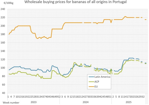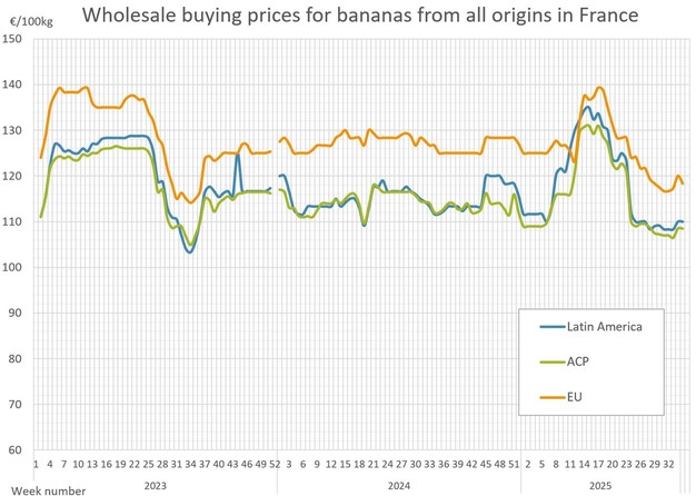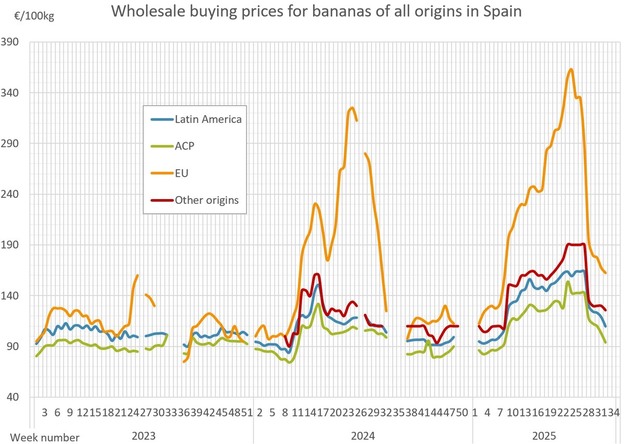 Los precios al por mayor de la banana en varios países europeos mostraron movimientos dispares entre la semana 33 (finalizada el 17 de agosto de 2025) y la semana 34 (finalizada el 24 de agosto de 2025), según los últimos datos del mercado.